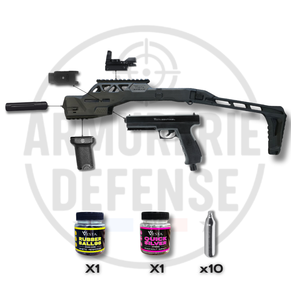 Le VESTA SPEAR PACK ULTIMATE est la version la plus avancée de la gamme Sentinel. Pensé pour les utilisateurs exigeants, il combine le pistolet VESTA Sentinel calibre .50 avec un ensemble d’accessoires tactiques haut de gamme : kit carabine SPEAR, rallonge de canon TACHYON S, viseur point rouge, poignée tactique, lampe/laser C1, et deux types de munitions pour s’adapter à toutes les situations.