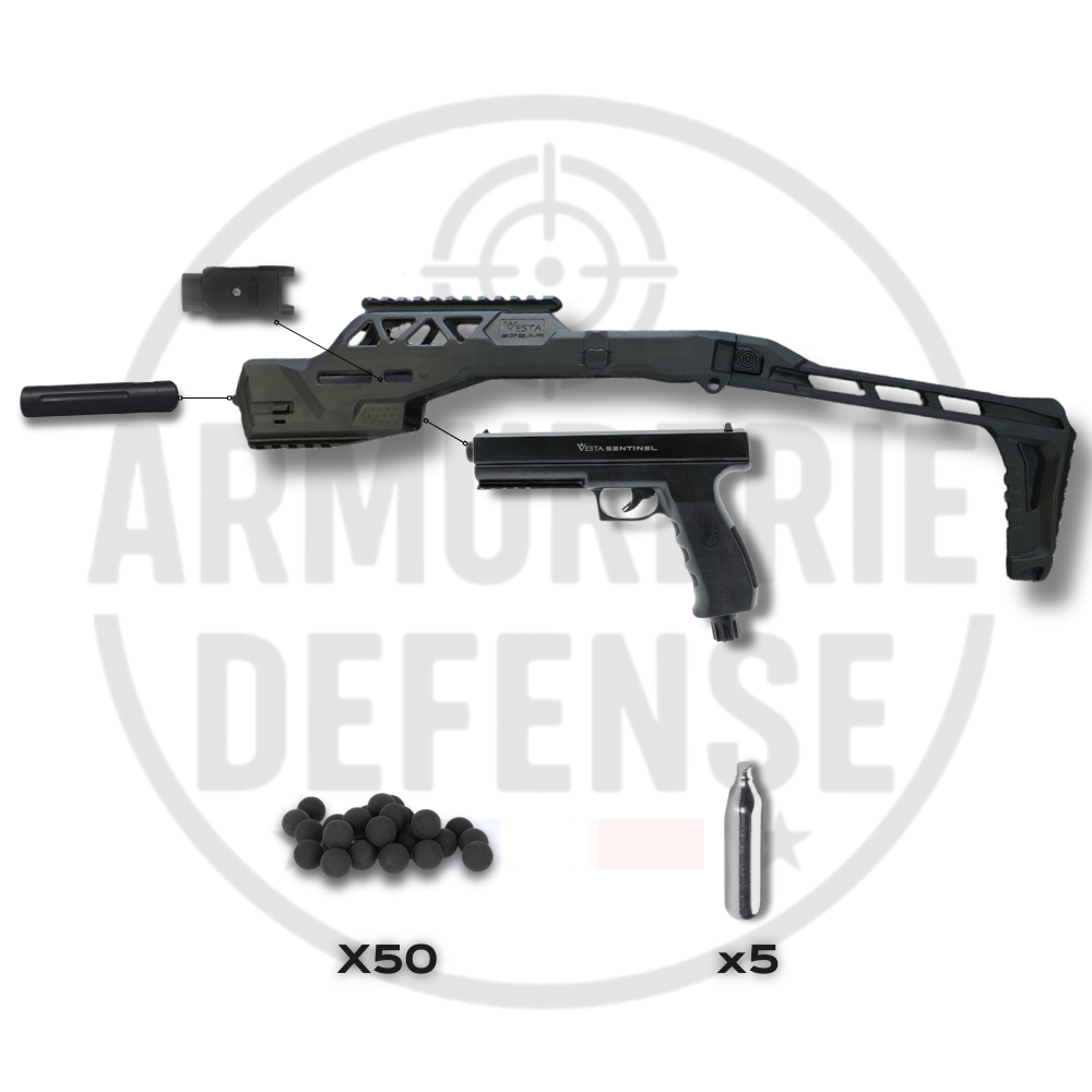 Le VESTA SPEAR PACK PREMIUM est une solution de défense hautement personnalisable, pensée pour ceux qui recherchent à la fois puissance, précision et modularité. Basé sur le lanceur CO₂ VESTA Sentinel calibre .50 (17 joules), ce pack comprend le kit carabine SPEAR, une rallonge de canon TACHYON, et un accessoire tactique au choix selon vos besoins.